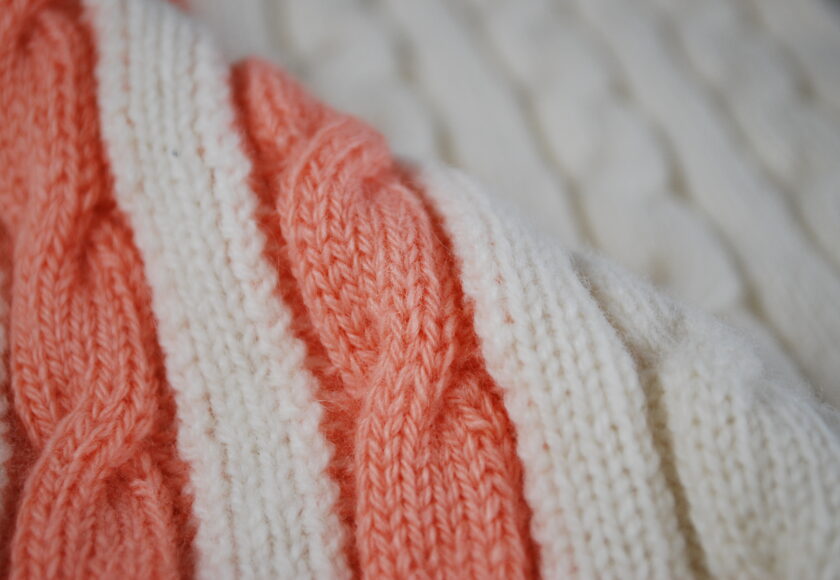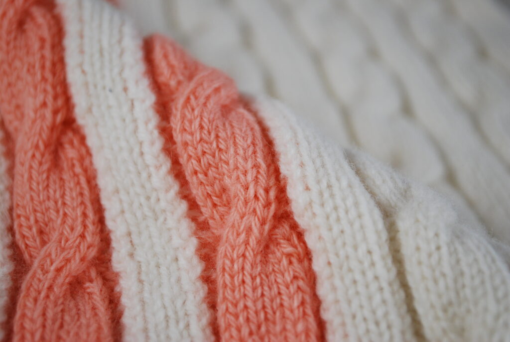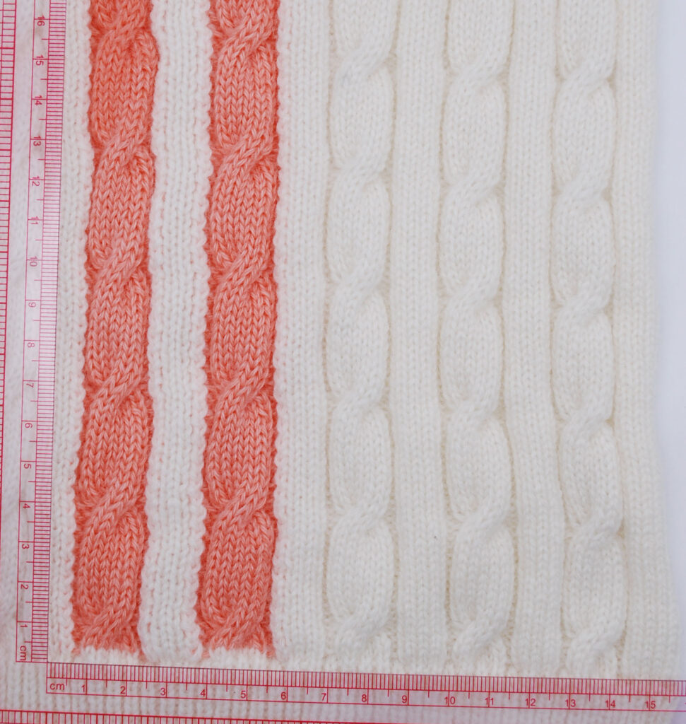 今回は LABOYORIで取り扱っている,メリノウール C/#10 OFF WHITE 2/20 ウール100 と Ecoウール C/#100 ORANGE 2/16 ウール100を使用して、配色ケーブルストライプの編地を作ってみました。